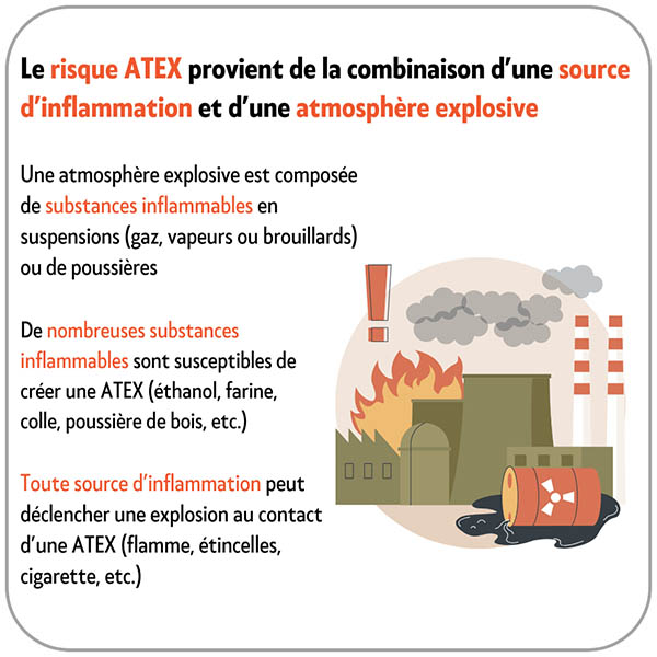 L'inflammation de l'atmosphère explosive est le déclencheur de l'explosion. Le risque ATEX provient donc de la combinaison d'une source de chaleur et d'une atmosphère explosive.