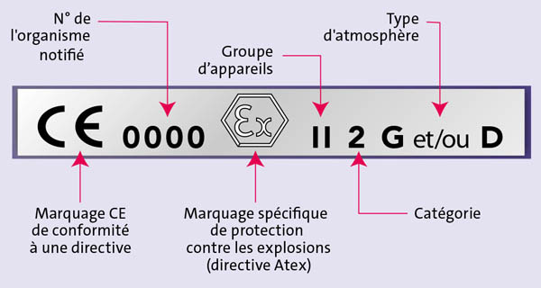 Les appareils et systèmes de protection ATEX disposent d'un marquage défini par le 1.0.5 de l'annexe II de la directive 2014/34/UE. Ce marquage sert à identifier les appareils conformes et adaptés aux différentes zones ATEX et comprend (Article R557-7-7 C.env.) :
