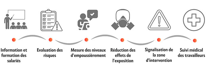 Focus : Un arrêté du 8 avril 2013 précise les règles techniques et les équipements de protection collective et individuelle à mettre en œuvre en fonction des niveaux d'empoussièrement.
